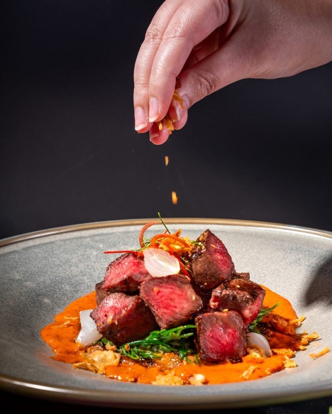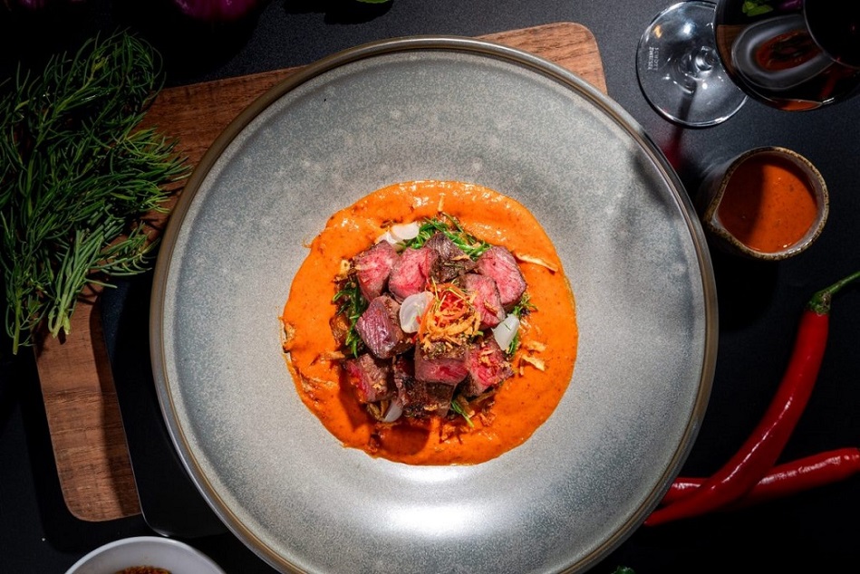 - Diners at Plate Restaurant can indulge in the “Grilled Wagyu Blade,” a signature dish that pairs the buttery tenderness of wagyu shoulder blade with rich Panang curry sauce, sea-kissed Cha-kram leaves, and a flaky, golden roti.